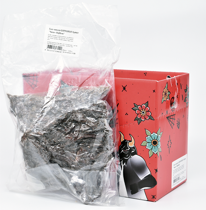 Большая полукилограммовая упаковка премиального вяленого снека из коллекции «Мясного картеля», изготовленный из мяса буйвола, вкус которого подчёркнут апельсиновым соком. Приправлен томатной пастой, луком, чесноком и традиционным набором специй и пряностей.