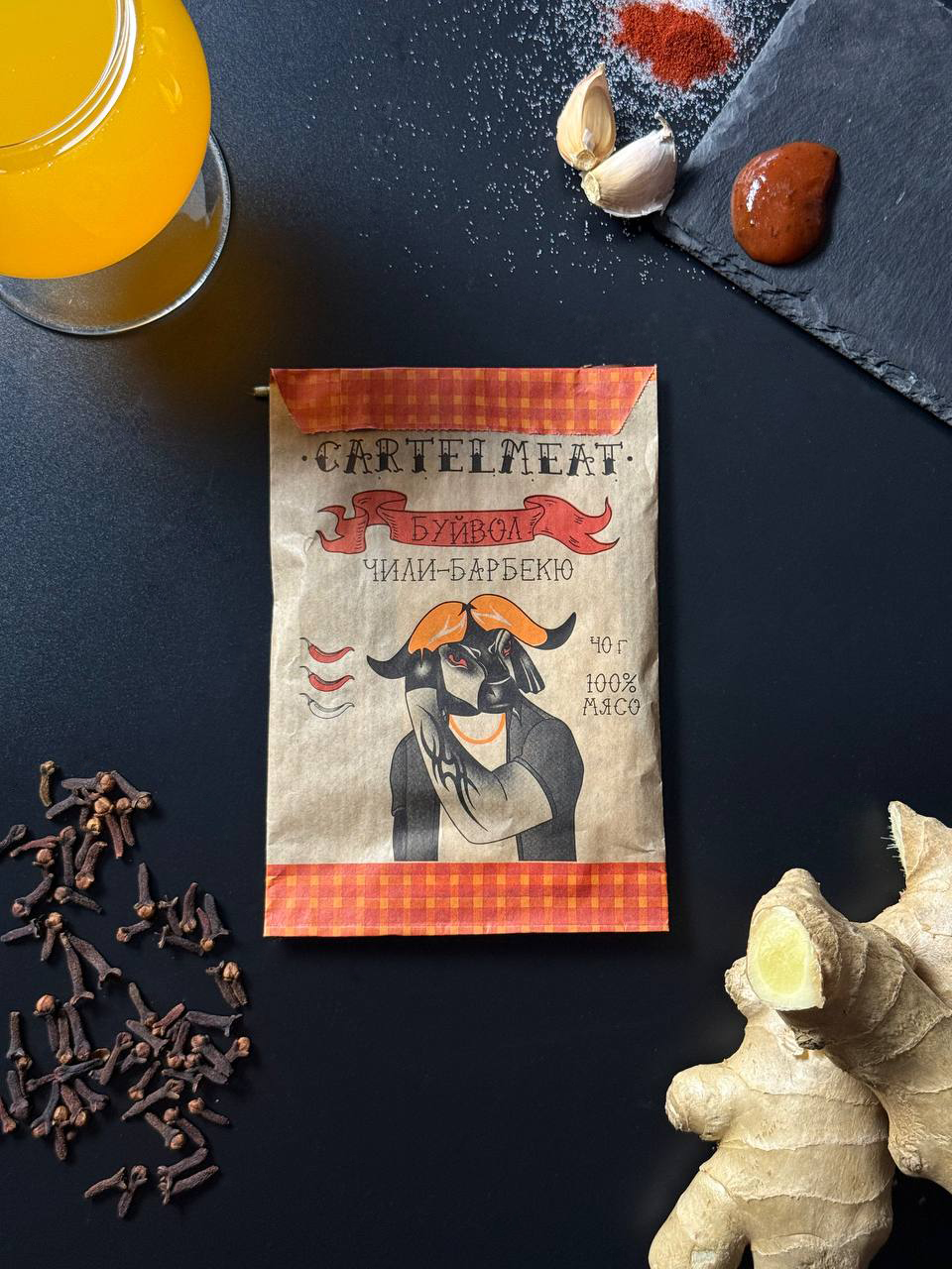 Премиальный вяленый снек из коллекции «Мясного картеля», изготовленный из мяса буйвола, вкус которого подчёркнут апельсиновым соком. Приправлен томатной пастой, луком, чесноком и традиционным набором специй и пряностей.