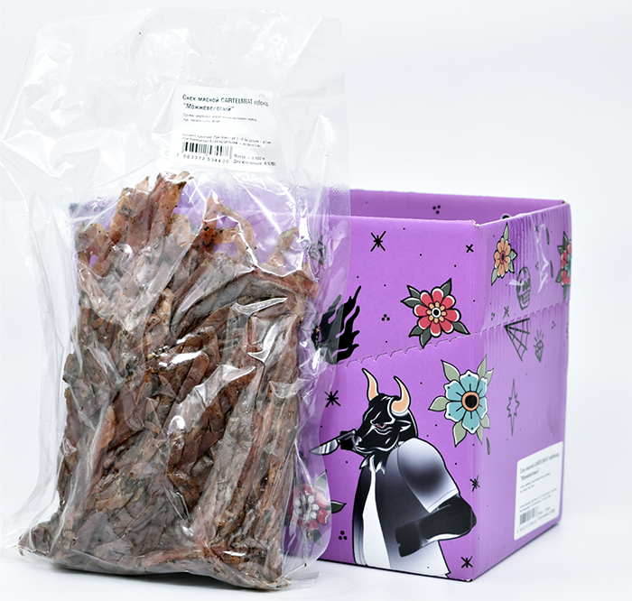 Большая полукилограммовая упаковка премиального вяленого снека из коллекции «Мясного картеля», изготовленный из отборного крабонада, приправленного ягодами можжевельника, кориандром и луком.