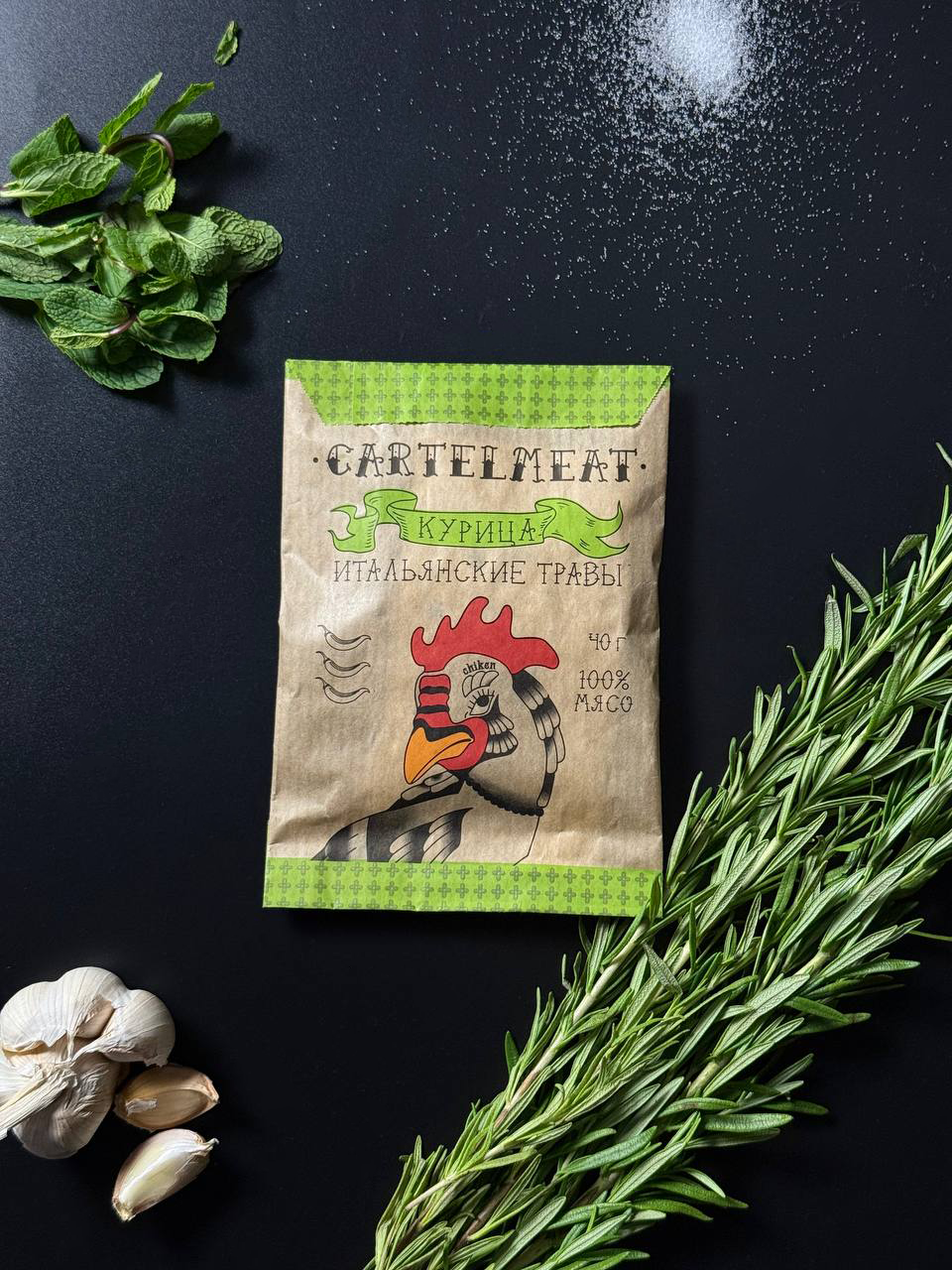 Премиальный вяленый снек из коллекции «Мясного картеля», изготовленный из отборнокуриной грудки, которая купается в ароматах мяты, розмарина, майорана в сопровождении обязательных лука и чеснока.